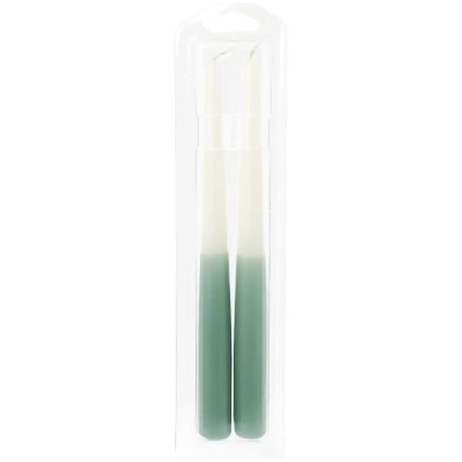 Lot de 2 flambeaux bicolores blanc et vert sauge, bougies décoratives type chandelier, thème hiver/Noël, format standard.