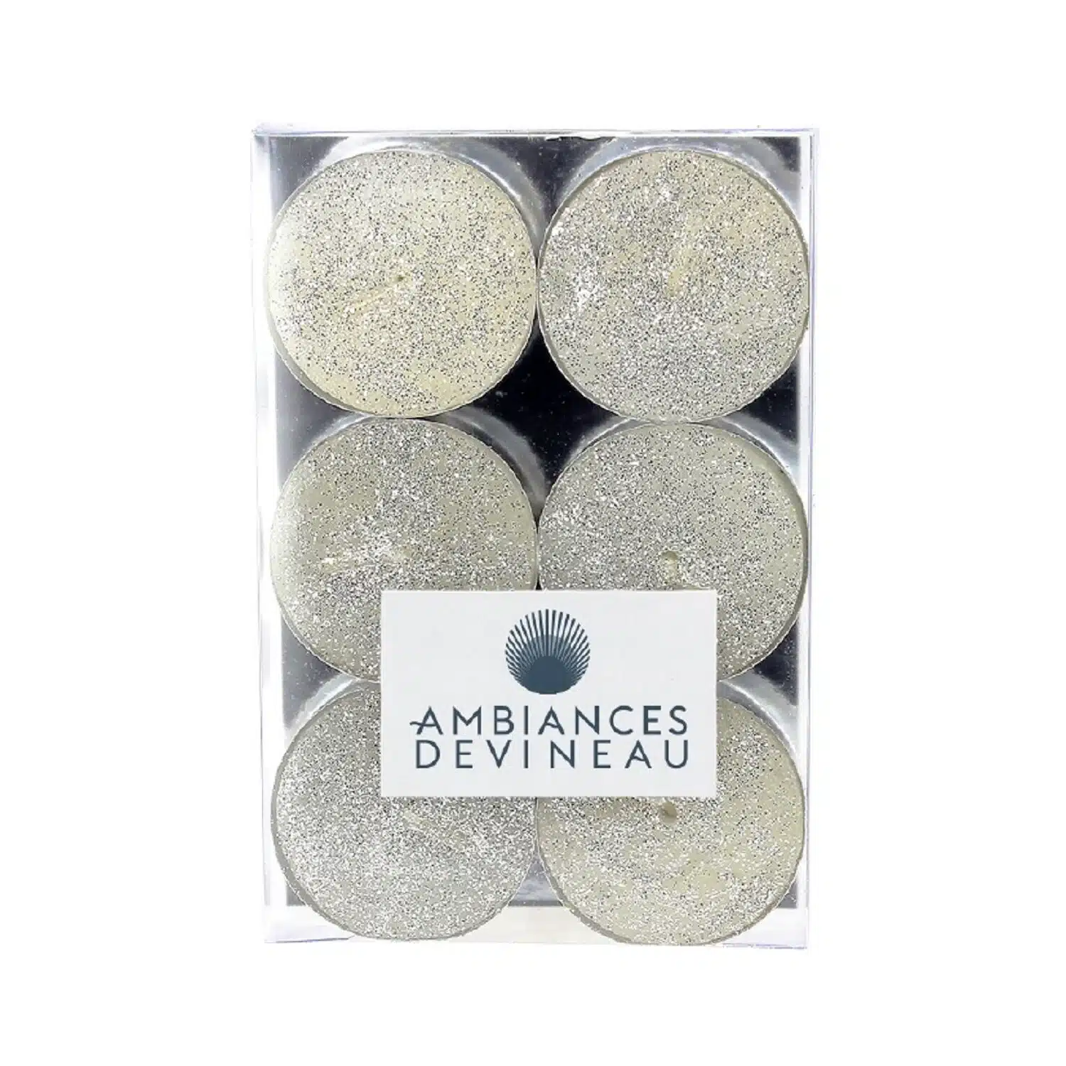 Ce lot de 6 bougies chauffe-plat argent AMBIANCE DEVINEAU illumine vos centres de table et photophores avec une touche chic et festive. Leur finition argentée est idéale pour les décorations de Noël, réveillons, mariages ou soirées élégantes.