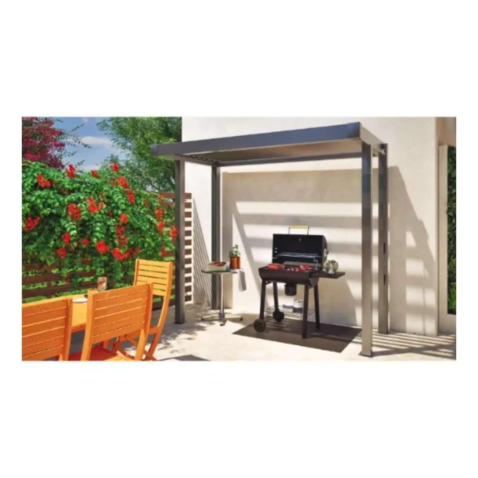 Transformez votre coin cuisine extérieure en un espace professionnel et protégé avec la tonnelle bioclimatique HYBA, spécialement étudiée pour abriter votre barbecue. Grâce à son toit innovant composé de lames en acier orientables manuellement par manivelle, vous gardez le contrôle total sur la ventilation et la luminosité : évacuez facilement les fumées de cuisson tout en restant parfaitement à l’abri du soleil ou d’une averse soudaine. Sa structure robuste en acier gris de 268 x 159 cm offre une protection durable et une stabilité exemplaire, vous permettant de profiter de vos grillades en toute sérénité, quelle que soit la météo.